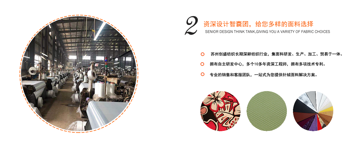蘇州創盛紡織有限公司坐落于江蘇省吳江市盛澤鎮圣塘村,自2004年成立以來,一直致力于中高檔功能型環保梭織面料的研發與經營,創盛紡織在專注幾十年面料經營中,不斷的完善管理,嚴格的把控品質,精準的創新產品,從而讓每一款面料滿足不同客戶的個性化需求,產品廣泛適用于:嬰兒用品、戶外旅行用品、運動休閑用品、箱包手袋、家庭收納用品等領域。
